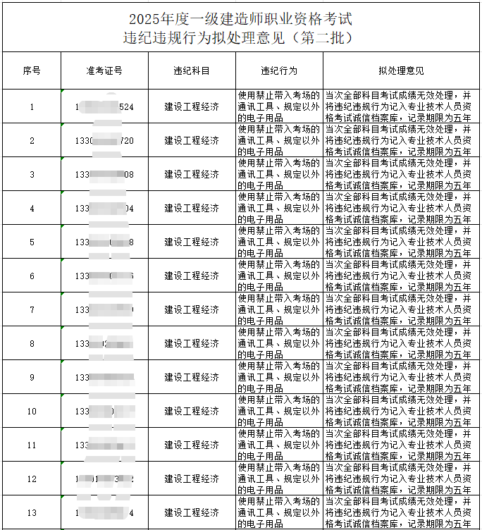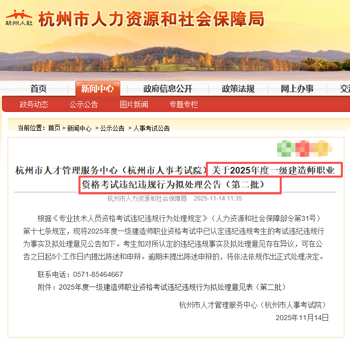 近日,浙江杭州发布关于《2025年度一级建造师职业资格考试违纪违规行为拟处理公告(第二批)》。