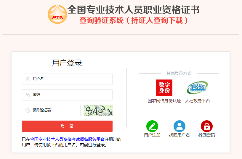 访问中国人事考试网(http://www.cpta.com.cn),点击首页左侧菜单中的【证书查验】,在打开页面点击【证书下载】,进入“全国专业技术人员职业资格证书查询验证系统(证书下载)”,具体操作步骤:
