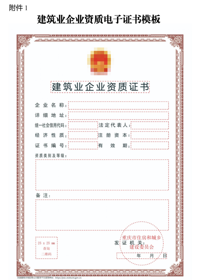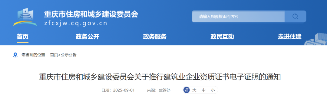 重庆市住建委发布《关于推行建筑业企业资质证书电子证照的通知》,明确:自2025年9月1日起,对全市范围内申请建筑业企业资质行政许可及施工劳务资质备案事项并获审批通过的企业,统一核发电子证照,不再制发纸质资质证书。