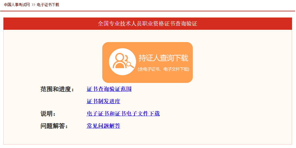 访问中国人事考试网(http://www.cpta.com.cn),点击首页左侧菜单中的【证书查验】,在打开页面点击【证书下载】,进入“全国专业技术人员职业资格证书查询验证系统(证书下载)”,具体操作步骤: